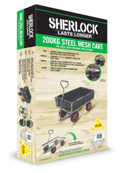 SHERLOCK 200KG Steel Mesh CartProduct Code: BBGC200S2Key Features:· Tray- Durable 200kg load hammertone steel mesh tray with liner (105 Litres)· Wheels - Standard 10” x 3.5” pneumatic wheels on steel rims· Handles- Powder coated hammertone steel handle with soft grip, push/pull pivot arrangement for easy steer/turn· Frame-Robust powder coated hammertone steel frameThe ideal cart for many applications.