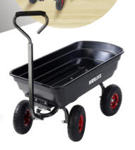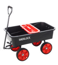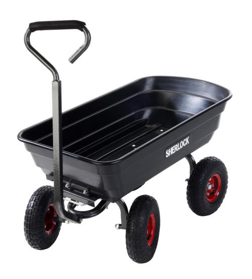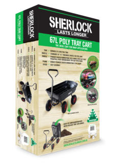 SHERLOCK 67L Poly Tray CartProduct Code: BBGC75Key Features:· Tray- Durable 67 litre poly tray· Wheels - Standard 10” x 3.5” pneumatic wheels on steel rims· Handle - Powder coated hammertone steel handle with soft grip, push/pull pivot arrangement for easy steer/turn· Frame - Robust powder coated hammertone steel frame with Easy-Tip configuration· Other- Easy assemblyThe ideal cart for all your DIY and garden work.