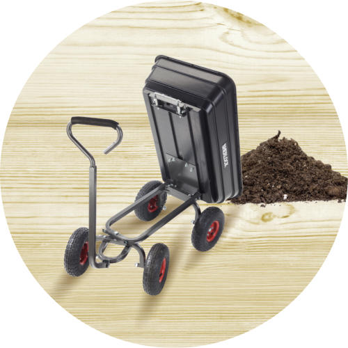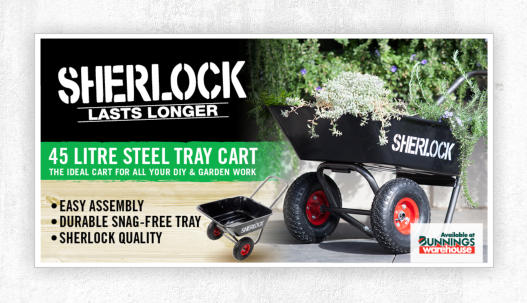 SHERLOCK Home Use 60L CartProduct Code: BBGC60PK2Key Features:· Tray- 60L U.V. Treated Premium Polypropylene Tray with a Double Lip for added strength· Wheels- Twin Solid Wheels for easy movement on a variety of surfaces· Handles- 25mm powder coated Steel Handle with crossbar and fitted grips· Frame- Robust powder coated hammertone steel frame· Other - Easy assembly & easy-tip configurationDesigned for the home gardener, ideal for carting potting mix, mulch or waste - well balanced and light.